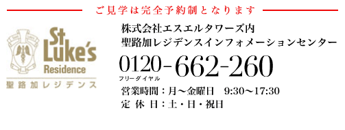 《聖路加レジデンス》へのご入居をお考えの方・詳しい資料をご希望の方、また空室状況の確認・ご質問等ございましたら下記までご連絡下さい。 尚、ご見学につきましては、事前のご予約が必要です。