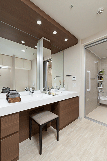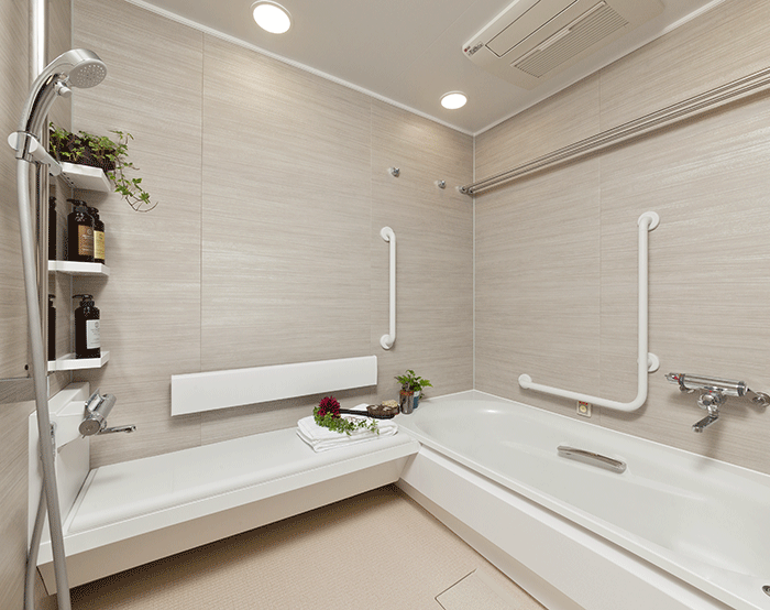 腰かけて身体が洗え、そのまま立たずに浴槽へ入れるベンチカウンターを設置。